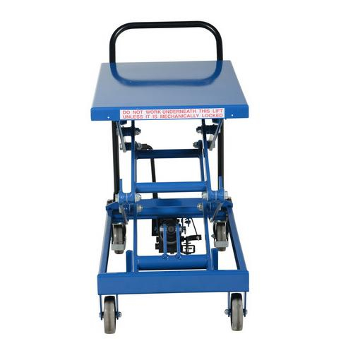 The Premium Scissor Lift Cart is constructed of heavy duty steel and designed to withstand the most demanding industrial environments. The simplicity and compactness of these products make them ideal for lifting and transporting loads, order-picking, die handling, and for use in support of assembly operations. There is little exertion required to raise and lower the deck due to the high quality foot-actuated, single speed hydraulic pump. The hydraulic system is equipped with an overload protection valve. Each cart has safety stops to prevent an empty deck from lowering while performing maintenance. A unique tilt-up table top allows for safe and easy maintenance. The two rigid front casters and two rear swivel polyurethane casters with brake provide a high degree of maneuverability; each swivel wheel is protected by guards and is equipped with brakes.