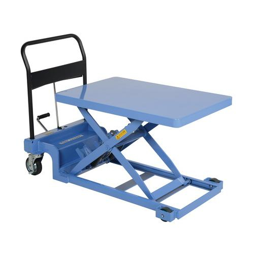 The Heavy Duty Rough Terrain Scissor carts are designed for landscaping and construction sites. The unit is ergonomically friendly with very little bending and lifting needed. The welded steel construction with powder coat blue finish can endure traversing over rough terrain on a daily basis.