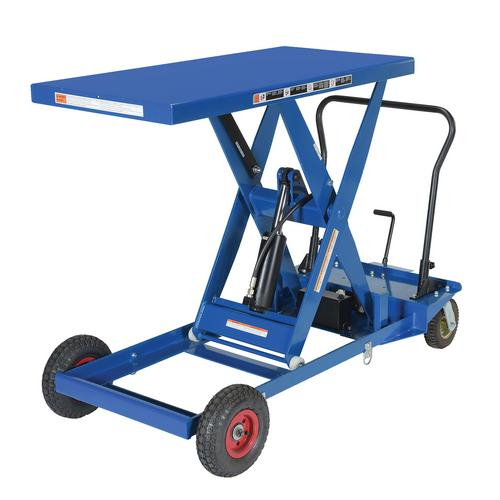 Heavy Duty Rough Terrain Scissor Cart is designed to be used at nurseries, gardens, construction sites and gravel pits. Large front and rear pneumatic tires allow for movement over most surfaces. Great for moving loads over terrain. Rough Terrain Elevating Cart minimize operator bending and lifting. Hydraulic system includes a soft-lowering down valve. Little exertion is required to raise and lower while performing maintenance. The simplicity and compactness of these carts make them ideal for lifting and transporting loads. Rugged welded steel construction. Baked-in powder coat blue finish for added toughness.