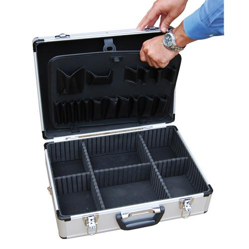 Rugged textured aluminum storage case with rounded corners. Lid interior includes removable panel with 13 storage pouches and 4 sleeves. Lower storage area includes segmented walls and adjustable panels in 1/4" increments. Molded plastic carrying handle. Includes removable shoulder strap. Quality locking latches included with two keys. Uniform capacity is 40 pounds.
