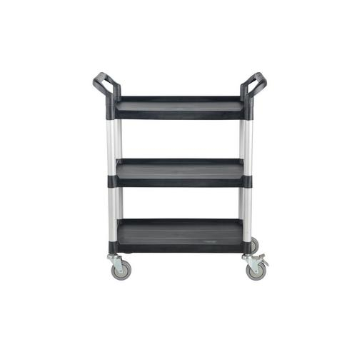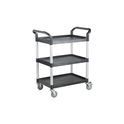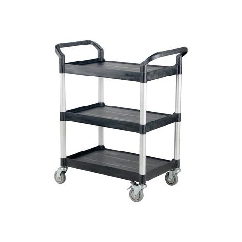 The food and service cart is ideal for the hospitality industry. The secure grip handles on the strong, yet, lightweight frame makes for easy maneuverability, while the low noise thermoplastic casters make transportation as quiet as possible. The steel constructed panels and slider drawer protects material from outside harm as well as accidental falling. Additionally, the semi-textured surface with perimeter lip prevents sliding of products while still being easily cleanable.