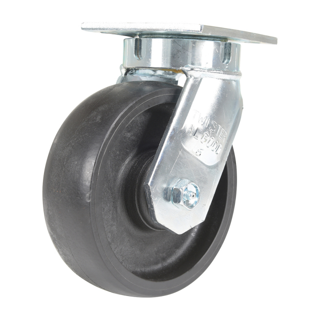Made of high-tech proprietary glass filled nylon (RX). Provides better impact resistance than standard glass filled nylon. Does not absorb moisture like phenolic, and offers better floor preservation than steel or cast iron. Resists most chemicals, solvents, gases, acids and steam cleaning. Top plate measures 4 x 4-1/2". Black tread color. 85 (+/-5) Shore D. Wheel core material is glass filled nylon.