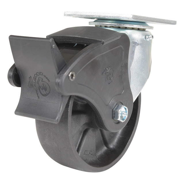 Made of high-tech proprietary glass filled nylon (RX). Provides better impact resistance than standard glass filled nylon. Does not absorb moisture like phenolic, and offers better floor preservation than steel or cast iron. Resists most chemicals, solvents, gases, acids and steam cleaning. Top plate measures 4 x 4-1/2". Black tread color. 85 (+/-5) Shore D. Wheel core material is glass filled nylon.