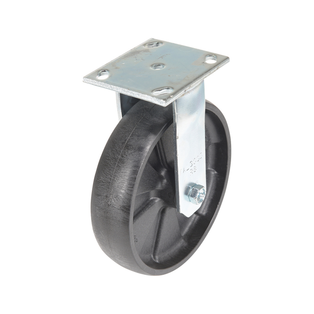 Made of high-tech proprietary glass filled nylon (RX). Provides better impact resistance than standard glass filled nylon. Does not absorb moisture like phenolic, and offers better floor preservation than steel or cast iron. Resists most chemicals, solvents, gases, acids and steam cleaning. Top plate measures 4 x 4-1/2". Black tread color. 85 (+/-5) Shore D. Wheel core material is glass filled nylon.