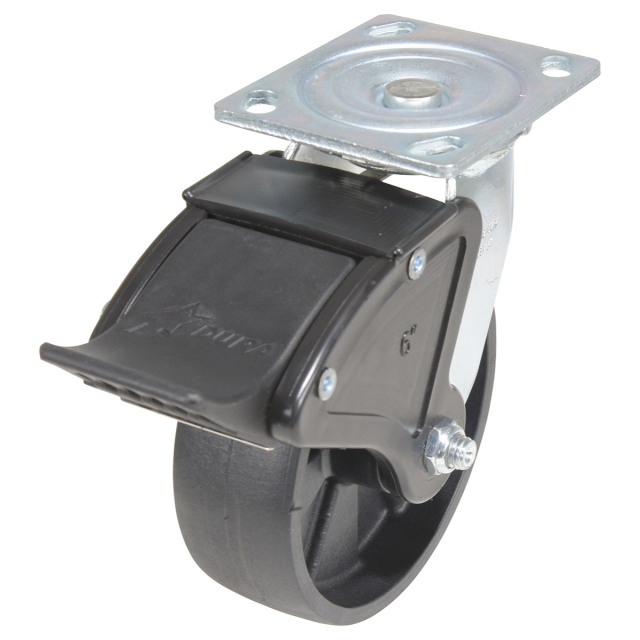 These glass filled nylon casters are constructed of a thermoplastic compound that is perfect for industrial and institutional applications. Resistant to most chemicals, salts, solvents, and steam. This tread does not absorb water and is non-marking. Black tread color. Wheel core is glass-filled nylon. 65 +/-5 Shore D.