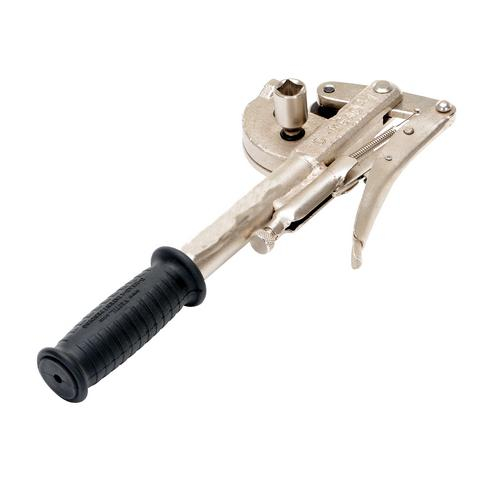Quickly remove the head of a steel drum with Express-Open Drum Deheader. Unique design, model D-HEAD-1, is similar to a household can-opener and is very easy to use. Includes vice-grip style mechanism for securely attaching unit to drum. Inside cutting blade does not leave a sharp edge on the drum. Only use either a 1/2" manual ratchet wrench or electric drill to operate the deheader ratchet (ratchet drive not included). Improper use of this drum deheader might result in personal injury or damage to the deheader. Do not use a pneumatic or electric impact wrench to operate the deheader ratchet.