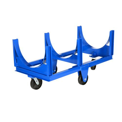 Move and store pipe, channel, bar stock, barrels, or drums with these Heavy-Duty Cradle Carts. A large open design that makes loading and unloading by fork trucks and slings easy. All welded construction. Wheels are mounted in a diamond pattern to allow the truck to tilt when going over thresholds and turnabout on its own center.