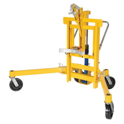 Unique portable unit designed to lift and transport steel, plastic, and fiber drums with a top lip. Steel jaw securely grips the top lip of the drum. Straddle legs rotate for access to drums on pallets. The push handle folds down for easy access to ratchet and foot pump. All welded steel construction. Baked-in powder coated toughness with a safety yellow finish.
