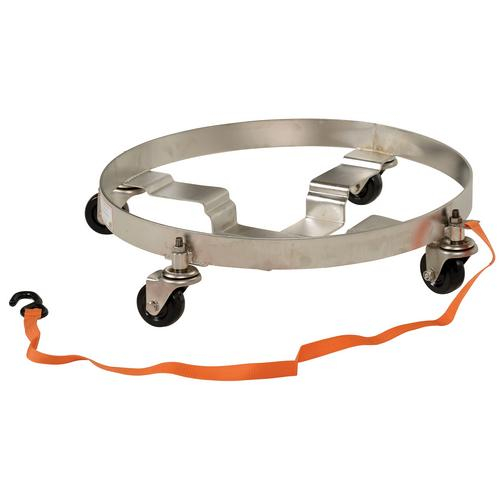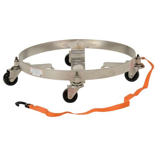 These multi-purpose dollies have a high polished bright zinc finish for corrosion resistance and (4) 3" x 1-1/4" swivel casters. Each unit comes with a 4 foot long nylon pull strap that helps in transporting down aisles or over thresh holds. Rubber-coated hook allows strap to hook on top of drum for storage.