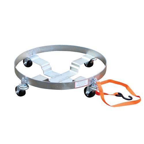 These multi-purpose dollies have a high polished bright zinc finish for corrosion resistance and (4) 3" x 1-1/4" swivel casters. Each unit comes with a 4 foot long nylon pull strap that helps in transporting down aisles or over thresh holds. Rubber-coated hook allows strap to hook on top of drum for storage.