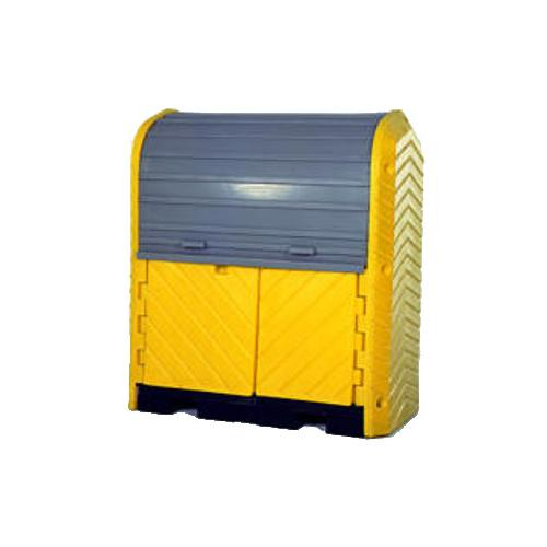 Store hazardous drums safely outdoors with pumps and funnels in place, Tall 2-3/4" head space easily accommodates rotary drum pumps and large conical funnels, Low profile (8-3/4") containment pallet positions drum-top funnels at safe, convenient level to pour hazardous wastes. Roll-top covers can be easily lifted from waist height to access drum tops -- no need to reach near ground level. Forkliftable, lockable, all polyethylene construction, will not rust or corrode.