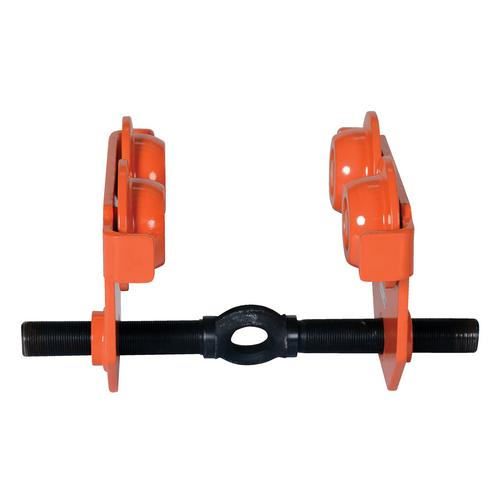 These trollies have been designed to quickly install on virtually any S, H,W, and M type I-beam. The width of the trolley is adjusted by rotating the center rod with lifting eye clockwise or counterclockwise. The trolley includes four rollers with sealed bearings for long life. A lifting eye is located at the bottom of the trolley for attaching a hoist (not included). Steel construction and painted finish. Headroom is measured from the bottom of wheel to bottom of hooking eye.
