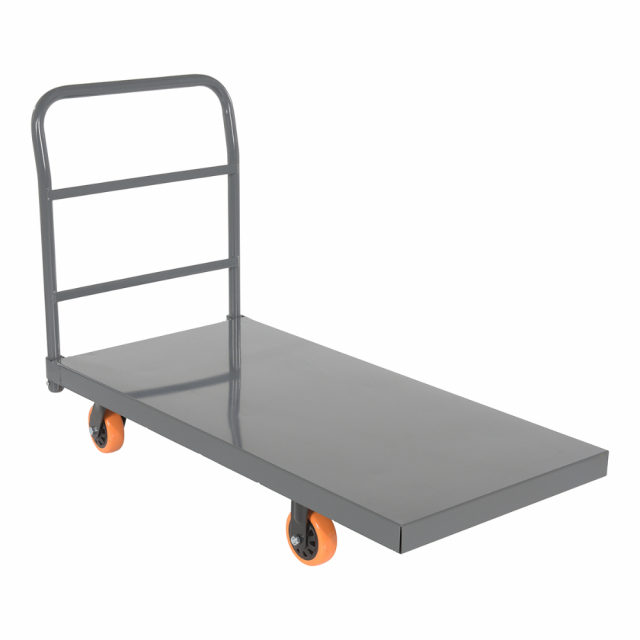 A steel platform truck is a perfect addition to any warehouse or shipping center. The steel platform design enables the user with a better sense of security. With a smooth surface, the amount of abrasion and scuffs during movement is limited. The steel handle allows the user to maintain an ergonomic posture while transferring goods. Mold on rubber casters roll smoothly. Powder coated finish provides added toughness.