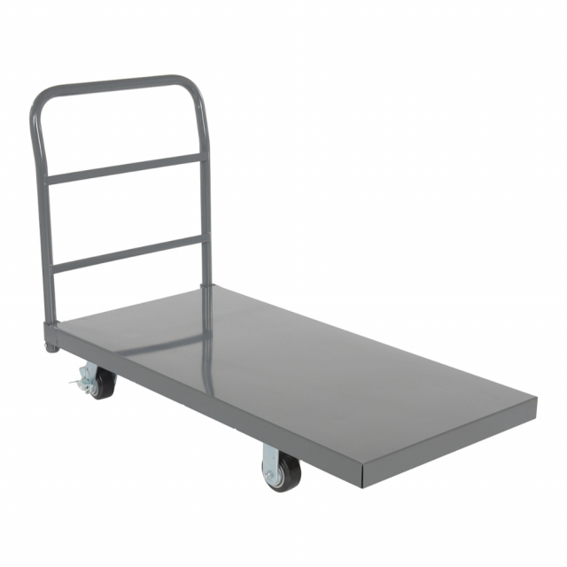 A steel platform truck is a perfect addition to any warehouse or shipping center. The steel platform design enables the user with a better sense of security. With a smooth surface, the amount of abrasion and scuffs during movement is limited. The steel handle allows the user to maintain an ergonomic posture while transferring goods. Mold on rubber casters roll smoothly. Powder coated finish provides added toughness.