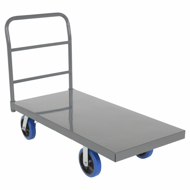 A steel platform truck is a perfect addition to any warehouse or shipping center. The steel platform design enables the user with a better sense of security. With a smooth surface, the amount of abrasion and scuffs during movement is limited. The steel handle allows the user to maintain an ergonomic posture while transferring goods. Mold on rubber casters roll smoothly. Powder coated finish provides added toughness.
