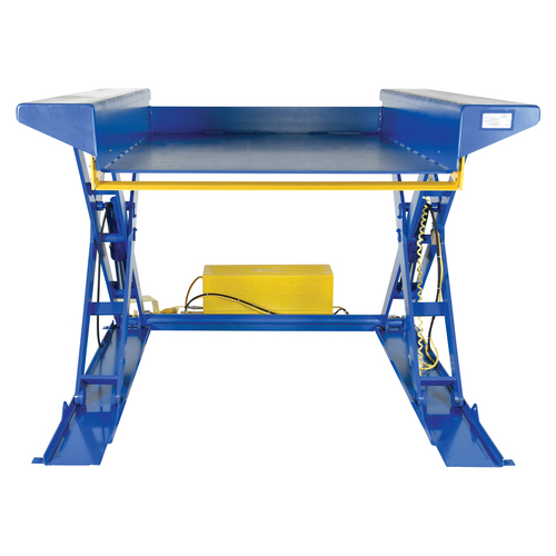 Ground Lift Scissor Table are designed for use when powered fork trucks are not available. Pallets can be loaded onto table with pallet trucks and raised to an ergonomic working height. Safety features include; front side electric toe guard to protect pinch points during lowering of the table, safety velocity fuse to stop falling due to loss of hydraulic pressure, foot control, maintenance prop, and upper travel limit switch to stop table at maximum height reducing motor wear. 2HP, 460V, 3-phase, 60 Hz totally enclosed motor is remote and can be located up to eight feet away from table. 3000 psi hydraulic components rating.
