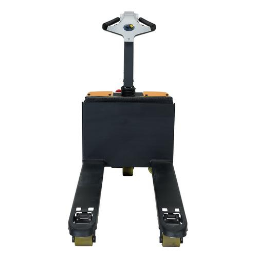 Fully Powered Electric Pallet Truck for easy and quick operation. Raise and lower loads with a push of a button. Maneuvers loads in warehouses and trailers. Reinforced welded forks with adjustable tie-rods give long service. High-torque 24V DC drive and lift motors handle heavy-duty jobs. Ergonomic handle features easy to operate throttle with infinite adjustment of forward and reverse speeds, lift/lower controls, proprietary safety-enhancing emergency reverse function, and horn. Includes an electromagnetic disc brake with automatic dead-man feature that activates when the user releases the handle.