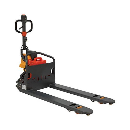This Electric Pallet Truck's compact, smart, and light weight design is suitable for a variety of low duty applications in warehouses or delivery applications. Low service weight is ideal for tail lift use. Designed for downtown deliveries. It has a low noise, high quality, Italian drive motor. Robust design. All parts are easily accessible and easy to maintain. Non-marking rubber drive wheel gives better traction. It is equipped with two (2) powerful 45Ah maintenance free AGM batteries. Battery pack is interchangable for continuous usage. Fast and easy battery exchange. Storage bins included on both sides of the truck. Effortless operation and low turning radius. Ergonomic tiller with battery indicator.
