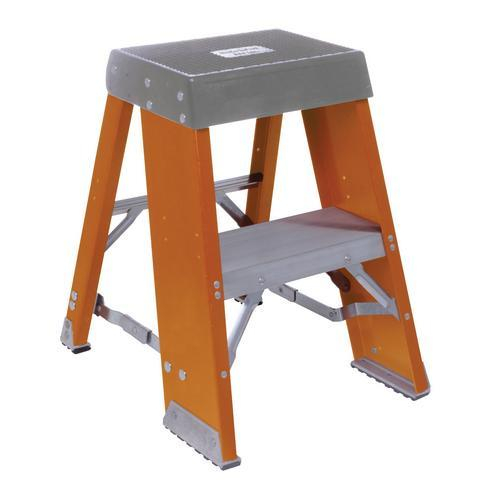 Fiberglass industrial step stands fold easily for easy transport and storage. These step stands are a nonconductive fiberglass heavy duty, multi-purpose industrial material, with a 300 lb duty rating. Units include a large molded top and double rivet construction.