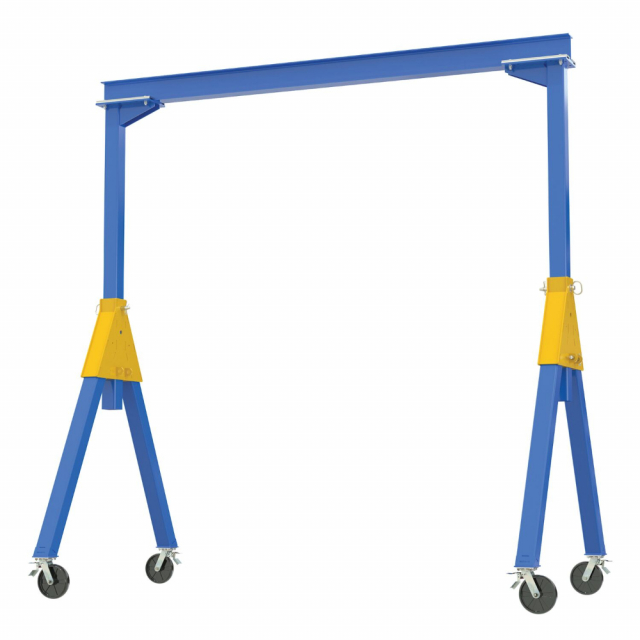 Fixed Height Knockdown Industrial Steel Gantry Crane are uniquely designed to be disassembled when not in use for compact storage and easier transportation / shipping from one job site to another. Facilitate easy mobility from one area to another with four (4) 8" swivel casters with four-position locks. Have glass filled nylon casters. Features quick setup design. Do not move units while loaded unless using V-Groove Caster and Track Option. Painted blue finish. Designed for semi-permanent or permanent applications. Requires assistance from fork truck to set-up.