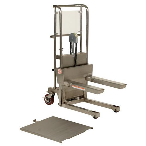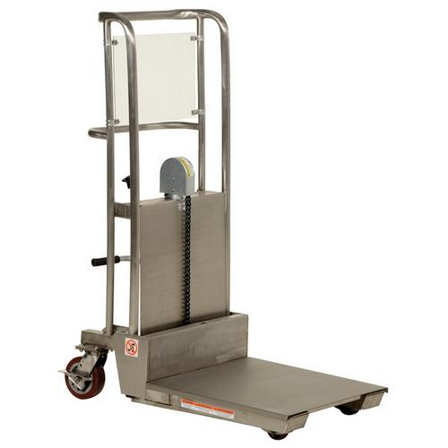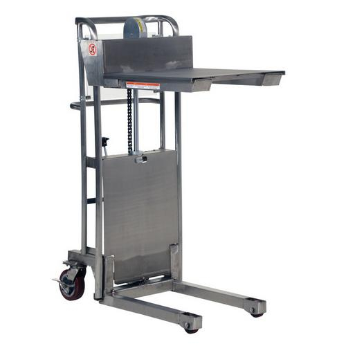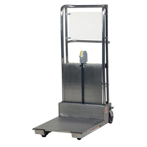 The Hefti-Lift is a user friendly, stainless steel portable hydraulic lift. The lift provides reliable, power lifting when moving and positioning loads. The non-slip chain is used for accurate positioning while the unit rolls easily on two rigid and two swivel poly-on-steel casters that includes a foot operated brake. The Lift is all welded construction and not for use with pallets.