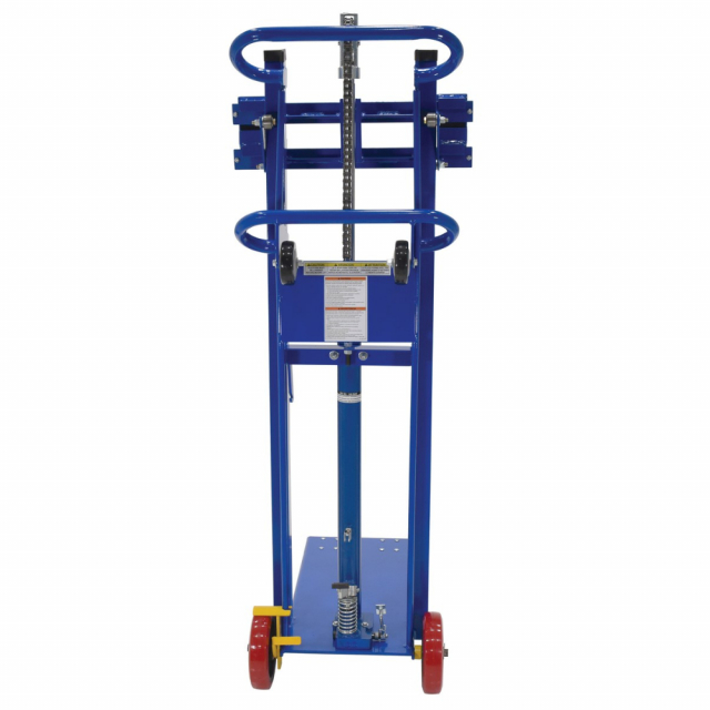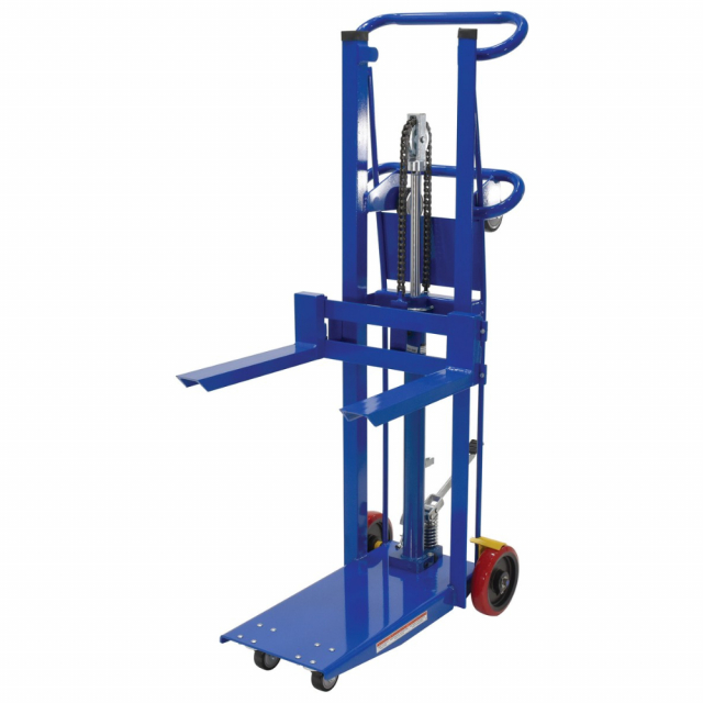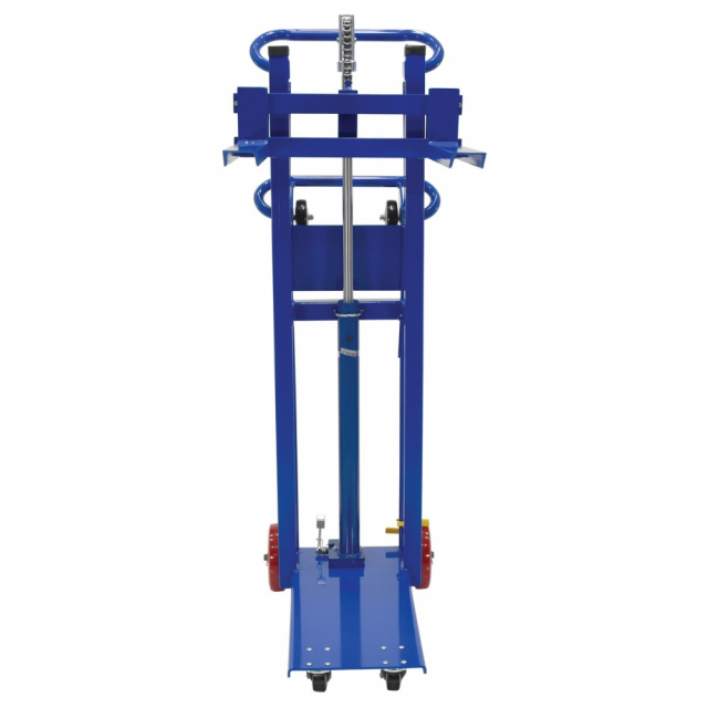 Transport loads in the lowered position and maneuver work materials to an ergonomic height. Ideal in compact work areas. Safe and easy one person handling of loads up to 1,000 lbs. An efficient way to unload heavy objects from semi trailers. Rugged steel construction for years of service. Dependable precision built hydraulic system is activated by easy action foot lever. Additional rollers on the handle make loading into a delivery truck easy. Steel construction. Approximately 1" of lift per pump. Model come standard with a single wheel brake.