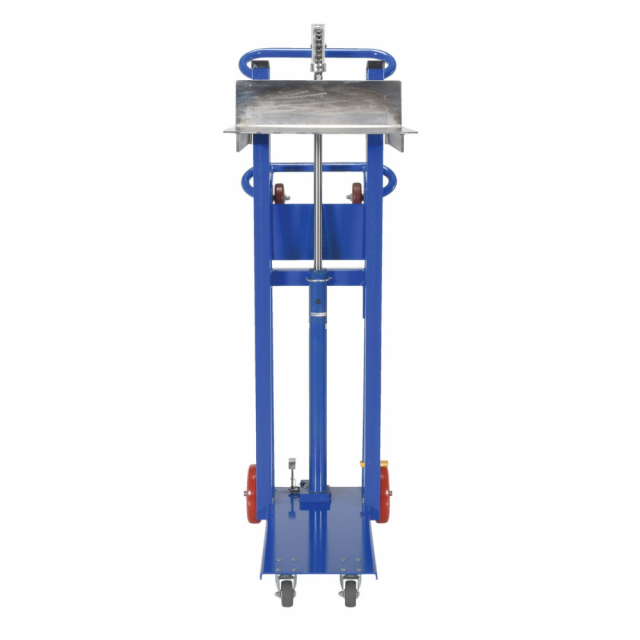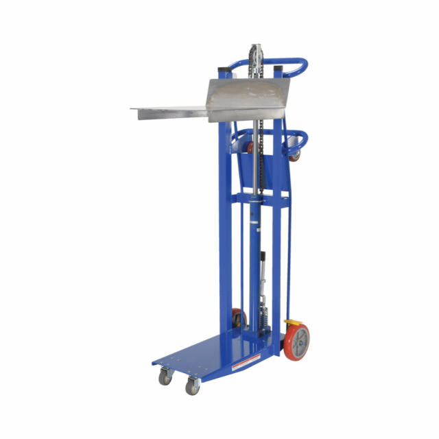 Transport loads in the lowered position and maneuver work materials to an ergonomic height. Ideal in compact work areas. Safe and easy one person handling of loads up to 1,000 lbs. An efficient way to unload heavy objects from semi trailers. Rugged steel construction for years of service. Dependable precision built hydraulic system is activated by easy action foot lever. Additional rollers on the handle make loading into a delivery truck easy. Steel construction. Approximately 1" of lift per pump. Model come standard with a single wheel brake.
