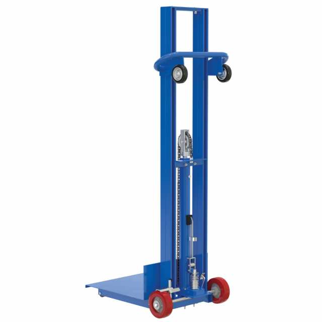 Lift and transport loads from delivery trucks to docks, or use to inventory storage systems. Easy to operate with either a hand winch or foot pump. The platform lifts approximately 1" per winch rotation or foot pump stroke. This model roll smoothly on 6" x 2" poly-on-poly rear wheels with 2" semi-steel front wheels. Horizontal load center is 10". Low Profile units have a deck height of 1/4" with 2" high side lips.