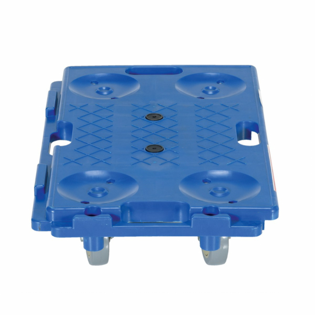 Strong, lightweight dollies include special interlocking edges that allow users to connect multiple dollies together to form a larger platform size. Hand holes are included for convenient carrying, while special pockets in the deck allow for easier stacking. Units roll on (4) swivel 4" x 1-1/4" polypropylene casters. Handle height when installed is 26".