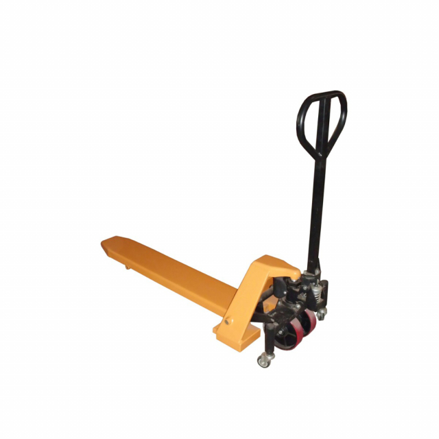 A single fork pallet master is the perfect accessory for maneuvering quarter and half size pallets. The simple hand pump design and lift function allows the user to lift and lower loads quickly. With a sleek powder coat finish baked in to a steel construction, this pallet master has a robust capacity for moving items large and small. The unit rolls on polyurethane casters, great for smoothly traversing a variety of surfaces.