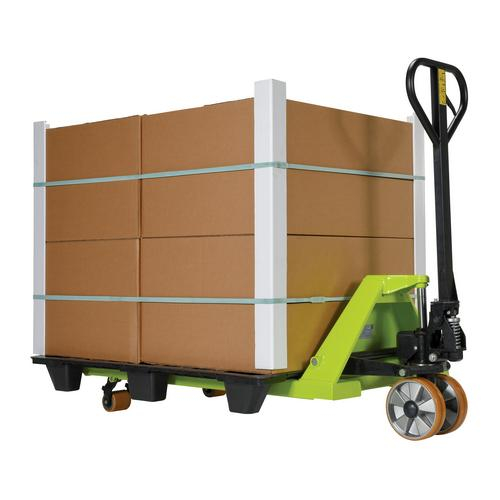 Easy to maneuver in tight spaces. Offers a combination of light frame and rollers with self-lubricating ball bearings. Handle is ergonomically designed for operator comfort, reducing lifting and rolling effort. Supplemental rollers allow an easier entrance and a quicker exit from the closed pallets. Features robotically welded frames for consistent strength. Easy to assemble handle.