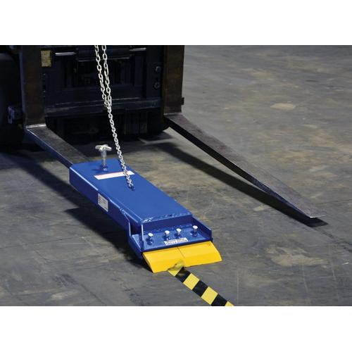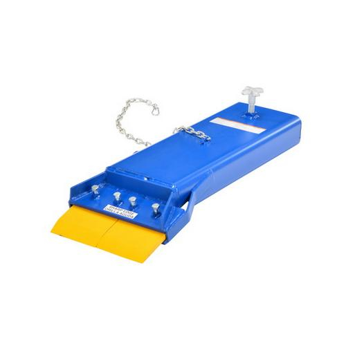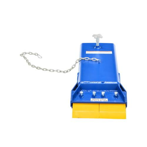 Turn your fork truck into a Floor Scraper. Works well in paint and finish rooms for removing over sprayed paint from floors. Simply slide fork into opening and attach safety restraint to carriage for safety. Features hardened scraping blade for long life and durability. Blade is mounted in pivot assembly to allow it to raise up with contact against a crack or rise in the floor. Heavy-duty welded steel construction. Painted finish.