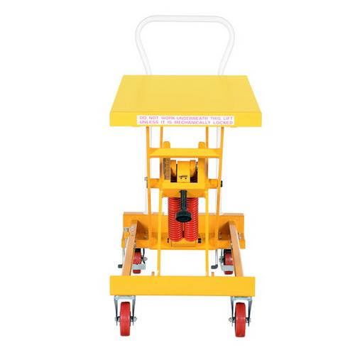 The Self-Elevating Lift Cart has an automatic height adjustment that provides ergonomic work positioning to increase productivity and decrease work related repetitive motion injuries. The unit has two springs with a heavy-duty steel construction and a bolt-on handle. The unit rolls smoothly on poly-on-poly casters, two rigid and two swivel with brake standard.