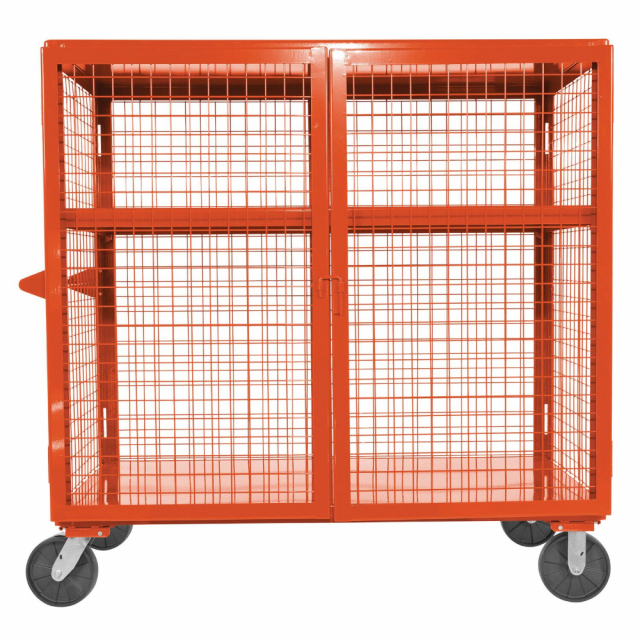 A welded security cart is a durable way to secure goods. The two shelf design, one upper shelf and one bottom platform, gives the user space and options of item placement. The distance between the two shelves allows items both big and small to be protected inside the cart. A hinged door lets the door swing for simpler loading and unloading.