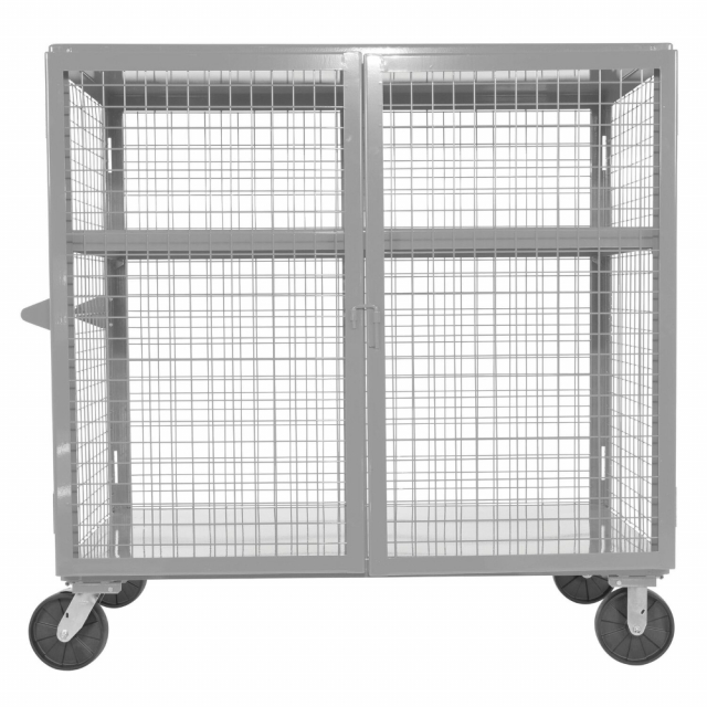A welded security cart is a durable way to secure goods. The two shelf design, one upper shelf and one bottom platform, gives the user space and options of item placement. The distance between the two shelves allows items both big and small to be protected inside the cart. A hinged door lets the door swing for simpler loading and unloading.