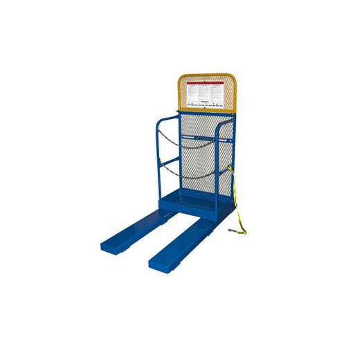 Elevate personnel and pallets to overhead racks and shelving for safe, convenient access. Accommodates one person and a 42" long pallet. Attaches to fork truck by inserting forks into fork pockets and chaining platform to fork truck. Pin type tine lock standard. 42" high handrail with 21" high mid-rail on two sides. 60" high expanded metal backing on fourth side (84" high backing to meet California OSHA specifications). Includes checker floor plate platform and 36" long chain with hook to attach platform to fork truck. Usable fork pocket size is 71⁄2"W x 21⁄2"H. Welded steel construction. Powder coat blue finish.