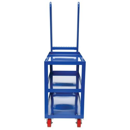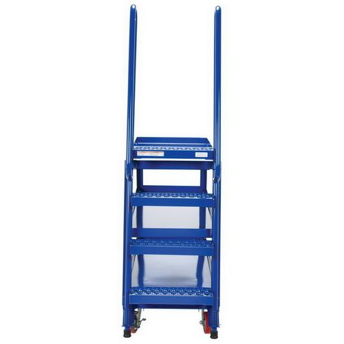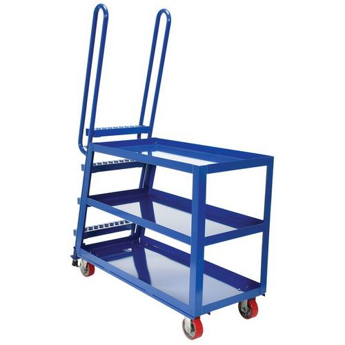 Combine the mobility of a cart with the versatility of a step ladder with this Stockpicker Truck. Convenient spring loaded step ladder holds the cart securely in place while a person is standing on the ladder. Crutch tip ladder prevents the cart from moving while stocking. Springs then return the ladder to the raised position once personnel exit the step. All shelves have the lip turned up to prevent items from falling off.