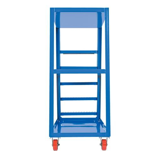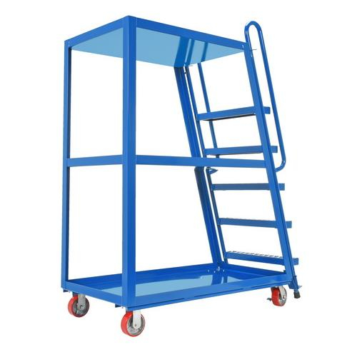 Combine the mobility of a cart with the versatility of a step ladder with this Stockpicker Truck. Convenient spring loaded step ladder holds the cart securely in place while a person is standing on the ladder. Crutch tip ladder prevents the cart from moving while stocking. Springs then return the ladder to the raised position once personnel exit the step. All shelves have the lip turned up to prevent items from falling off.
