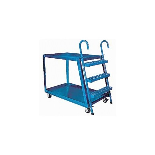 Combine the mobility of a cart with the versatility of a step ladder with our Stockpicker Trucks. Convenient spring loaded step ladder holds the cart securely in place while a person is standing on the ladder. Crutch tip ladder prevents the cart from moving while stocking. Springs then return the ladder to the raised position once personnel exit the step. All shelves have a 2" lip turned up to prevent items from falling off. Standard casters are 4" x 2" mold-on-rubber, two rigid and two swivel with wheel brakes.