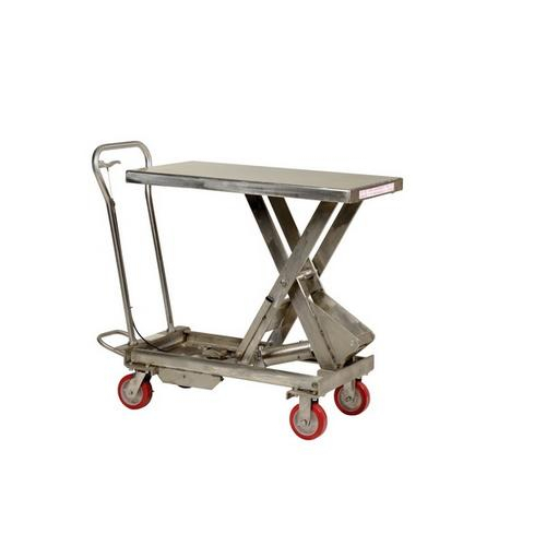 This fully welded Model Stainless Steel Scissor Cart resist corrosion in wet environments. All parts are made from stainless steel, including the hydraulic pump and foot pedal. This cart is suitable for most food, medical, and pharmaceutical industry. Also suitable for wash-down applications. Unit feature a high quality actuated, single-speed hydraulic foot pump with pressure compensated valve for controlled platform lowering.