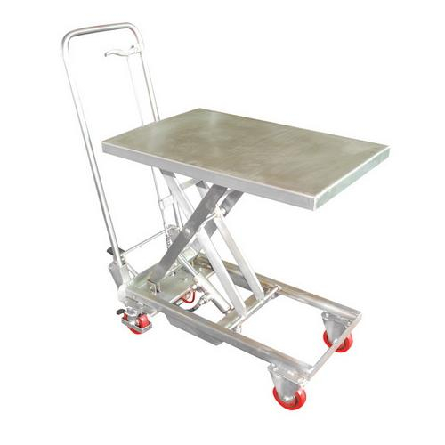 This fully welded Model Stainless Steel Scissor Cart resist corrosion in wet environments. All parts are made from stainless steel, including the hydraulic pump and foot pedal. This cart is suitable for most food, medical, and pharmaceutical industry. Also suitable for wash-down applications. Unit feature a high quality actuated, single-speed hydraulic foot pump.