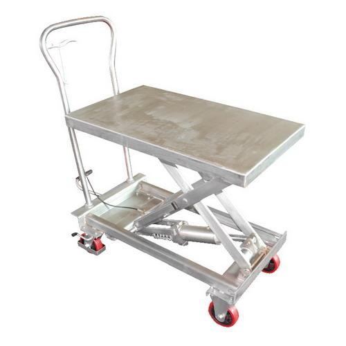 This fully welded Model Stainless Steel Scissor Cart resist corrosion in wet environments. All parts are made from stainless steel, including the hydraulic pump and foot pedal. This cart is suitable for most food, medical, and pharmaceutical industry. Also suitable for wash-down applications. Unit feature a high quality actuated, single-speed hydraulic pump.