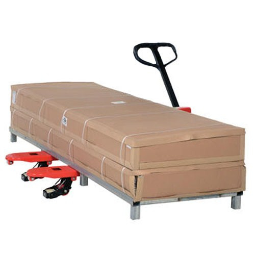 Transport long loads down narrow aisles with this heavy-duty Sidewinder Pallet Truck, model SW-PJ. This versatile Pallet Truck retains all the quality workmanship of a standard pallet truck in addition to providing lateral movement. Simply place the forks into the pallet then elevate to approximately seven inches, rotate handle, and lock detent into place. The second set of rollers, right/left, are actuated. Now push the Side Winder perpendicular to the traditional direction.