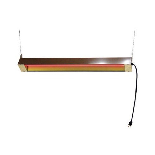 Keep your cooler work areas well heated with these Infrared Heaters. The Quartz tube radiates a blanket of heat in a 60° symmetrical pattern. Unit includes; gold aluminum reflector and end caps, mounting chains, S hooks and a cord set with plug. Units can be hung from the ceiling with mounting chains. For indoor use, outdoor use needs to be protected from the elements using a solid overhang.