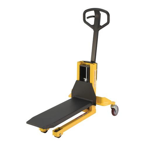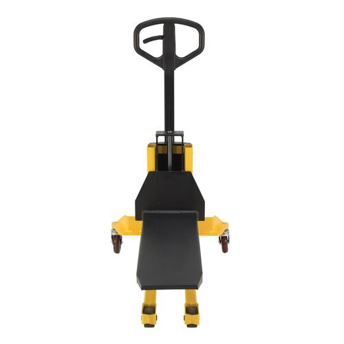 A single fork skid positioner lifter is a new design of an old classic. Instead of the usual two skinny forks to lift open bottom skids, crates, and baskets this model has one large centered fork. The fork is open on 3 sides for easy loading and unloading of products. The high handle not only allows for steering, but as the pumping mechanism to raise and lower the height of the fork. Unit rolls on 5" poly-on-poly casters and includes a foot brake for secured positioning during transition periods. The compact design takes up minimal storage space, when not in use.