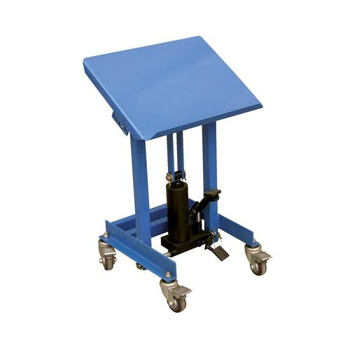 The Hydraulic Work Positioner is ideal for either sitting or standing applications at work assembly areas with a lip that retains plastic bins and organizers. It has a spring loaded detent that controls the tilt angle and a hydraulic foot pump with a telescoping cylinder that provides service range.