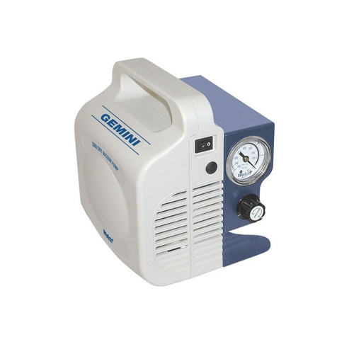 Bring vacuum to where you need it. GEMINI pumps operate on DC power and are readily used with a car adapter or 120VAC adapter. Excellent vacuum for filtration or sampling - 190 torr, 13 l/min. Small, lightweight, portable, includes gauge and vacuum regulator. Polyarlyamide heads, fluorpolymer elastomer diaphragms, tubing, valves.