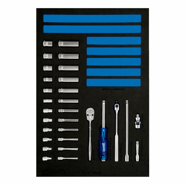 Williams, JHWFMSM-30HF, 30 piece 1/4 Drive 6 Point Metric Shallow & Deep Sockets & Drive Tool Set in 1/3 Foam Drawer Insert