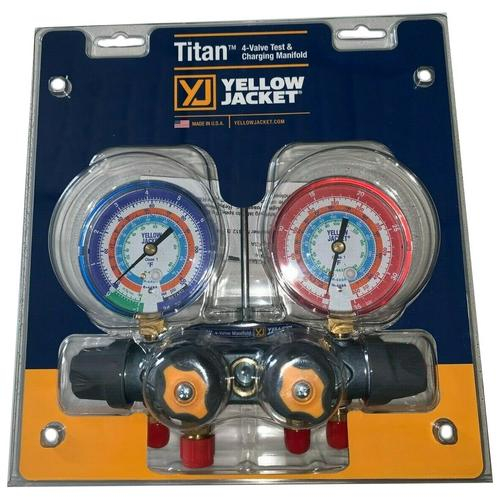 Yellow Jacket, 49907, Titan Test and Charging Manifold, 4-Valve, bar/psi °F, R448A/449A/452A, Red/Blue Gauges