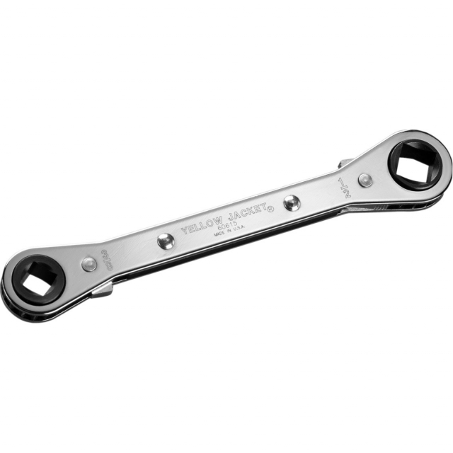 The Yellow Jacket 60615 is a refrigerant wrench for large valves. The 60615 is a reversible ratchet wrench with square openings: 1/4" and 3/16" at one end; 3/8" and 5/16" at other end.